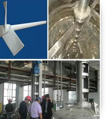 聚合釜、合成釜、萃取釜、精餾釜,加氫釜攪拌目的只要化學聚合過程需要強的剪切和混合能力的攪拌達到物料之間溶解分散聚合的過程,罐體比功率大,常增加變頻控制裝置防止啟動過程的大扭矩和過程變化中調節速度以節約能耗。使用的攪拌器形式有:三葉后掠式(HQ),開啟渦輪式(XKK,MK,ZK)等,雙折葉槳式(SJ、CJ)等。
